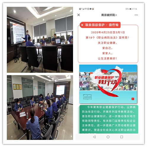 在2020年第18个《职业病防治法》宣传周期间,南京玻纤院团委组织各团支部积极开展“职业健康保护·我行动”活动。南玻团委结合当前疫情防控形式和各单位复工复产实际情况,通过微信公众号、企业微信群等开展了以线上为主的各类宣传活动,有条件的团支部组织一线班组长、技术人员开展职业病危害及预防讲座,倡导和动员全院职工共同关注劳动者职业健康,切实将职业病的相关知识在青年职工中进行普及和宣传。